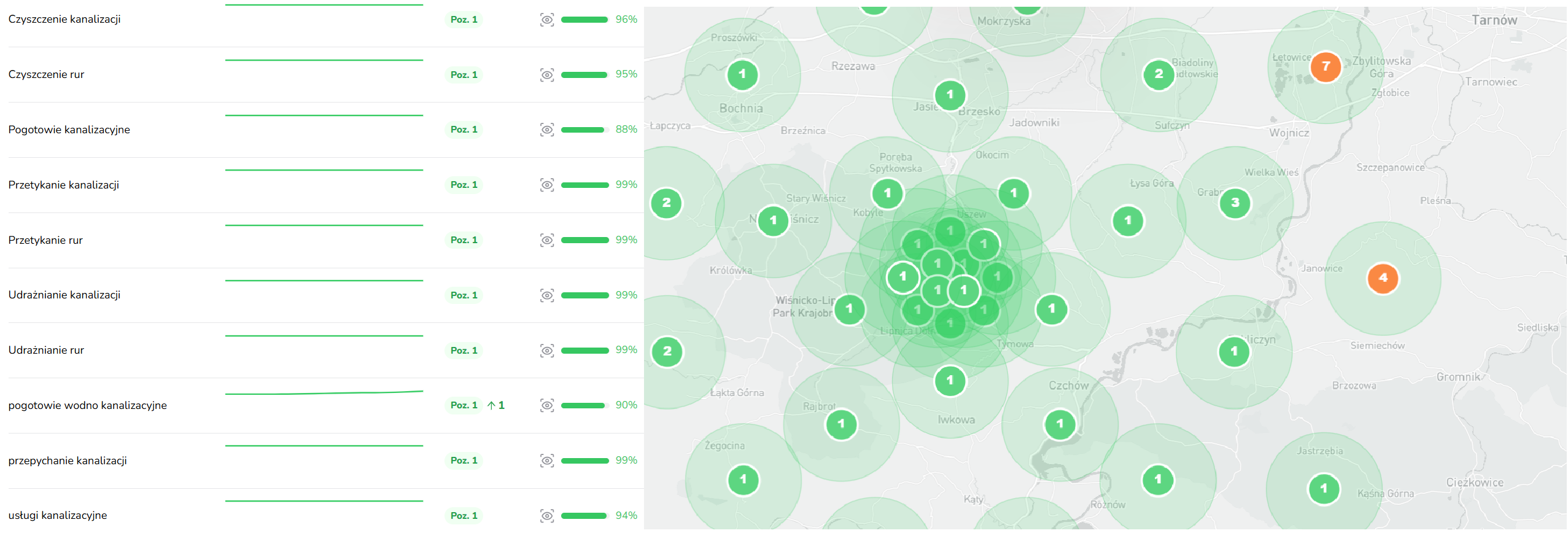 Kompleksowe działania przynoszą wzrosty pozycji nawet w odległych obszarach o promieniu 50km, pomimo lokalnych firm, które również świadczą takie same usługi.